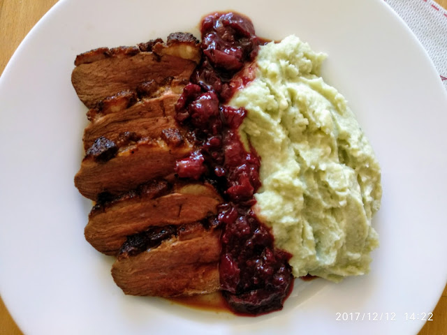 Magret de pato con salsa de cereza y puré de patata con queso azul