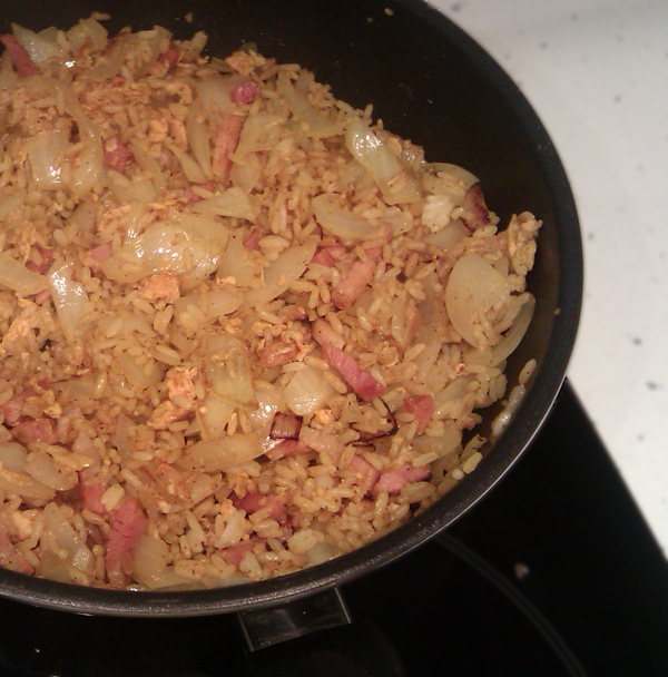 En otra cazuela distinta (la principal) sofreímos la cebolla con una cucharada de aceite de oliva y cuando empiece a estar transparente, echamos las tiras de bacon, lo movemos un minuto y a continuación añadimos el arroz, movemos todo otro minuto, y echamos la tacita de vino. Removemos en circulo hasta que el vino se evapore.