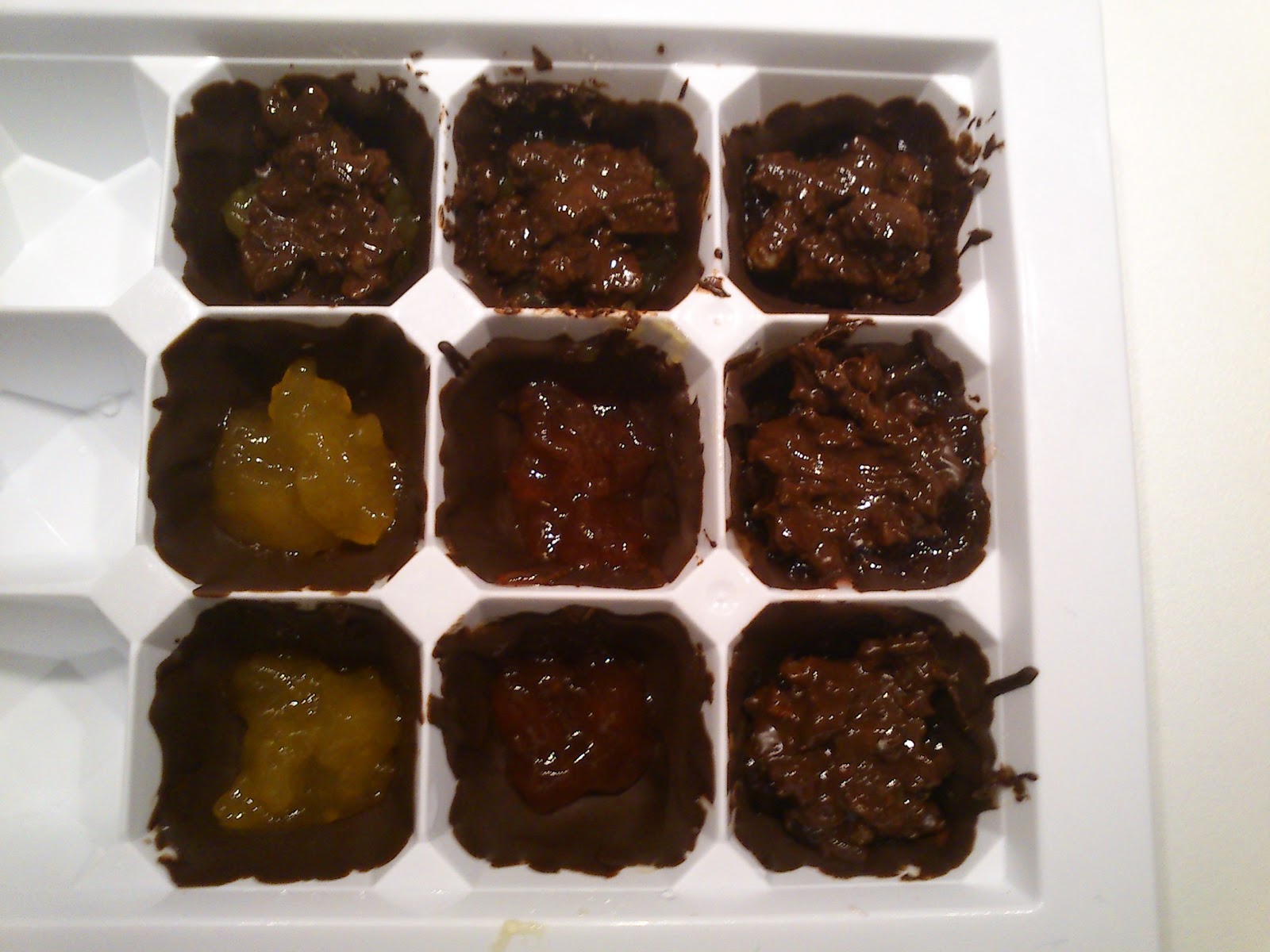 Y ahora sólo falta terminar de rellenar el bombón. Echamos un poco de mermelada en cada hueco y luego un poco de la masa de nueces. Finalmente, terminamos de tapar el bombón con el resto de chocolate fundido con un cuchillo para que quede lo más plano posible. Dejamos enfriar en la nevera y ya está, Desafío conseguido!!