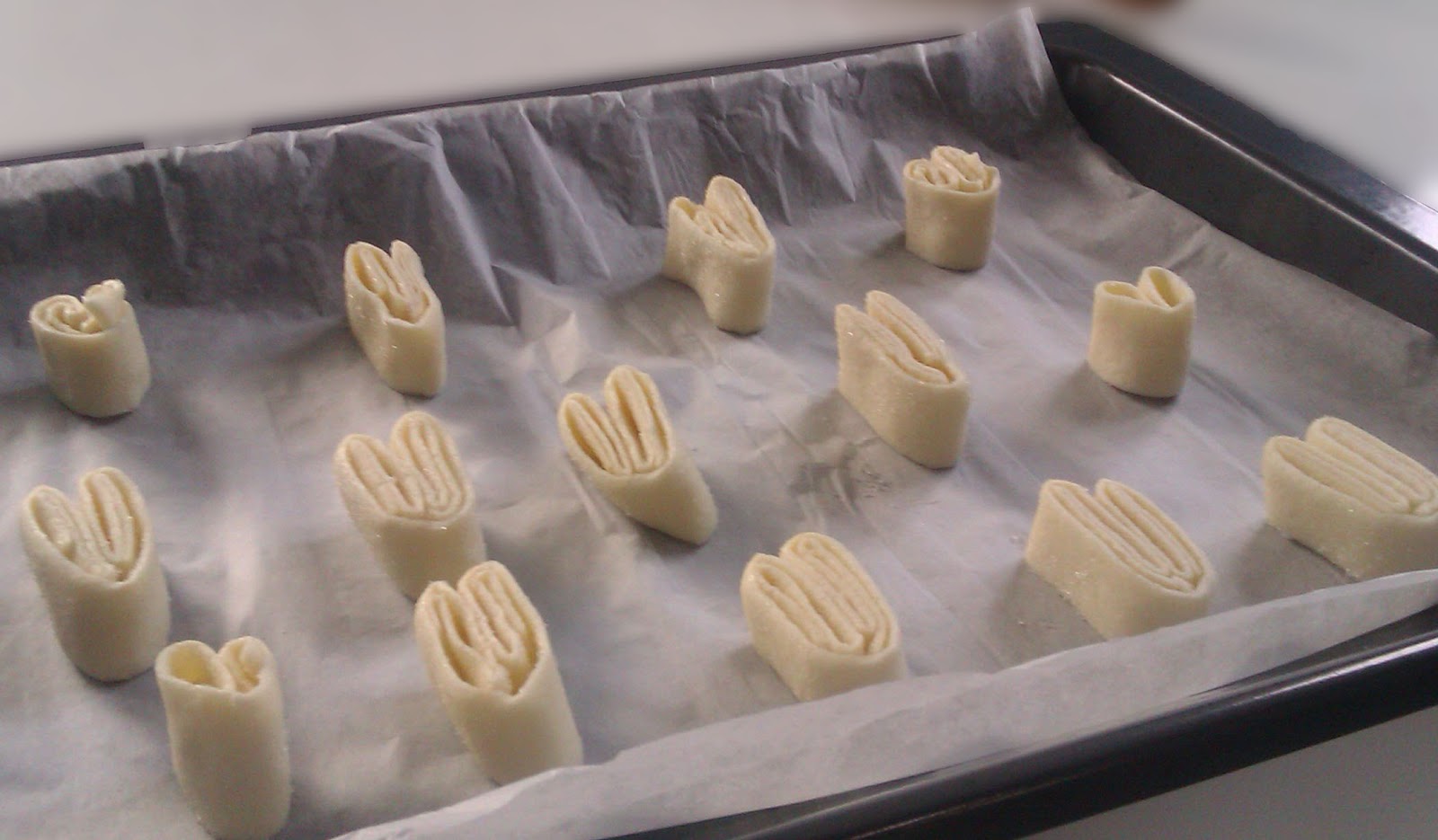 Cuando hayamos doblado, con un buen cuchillo y rápido hacemos cortes de 1 cm, y las ponemos en la bandeja del horno, aprovechando el papel que viene con la masa del hojaldre. Las tenemos que poner muy separadas, porque crecen muchísimo!