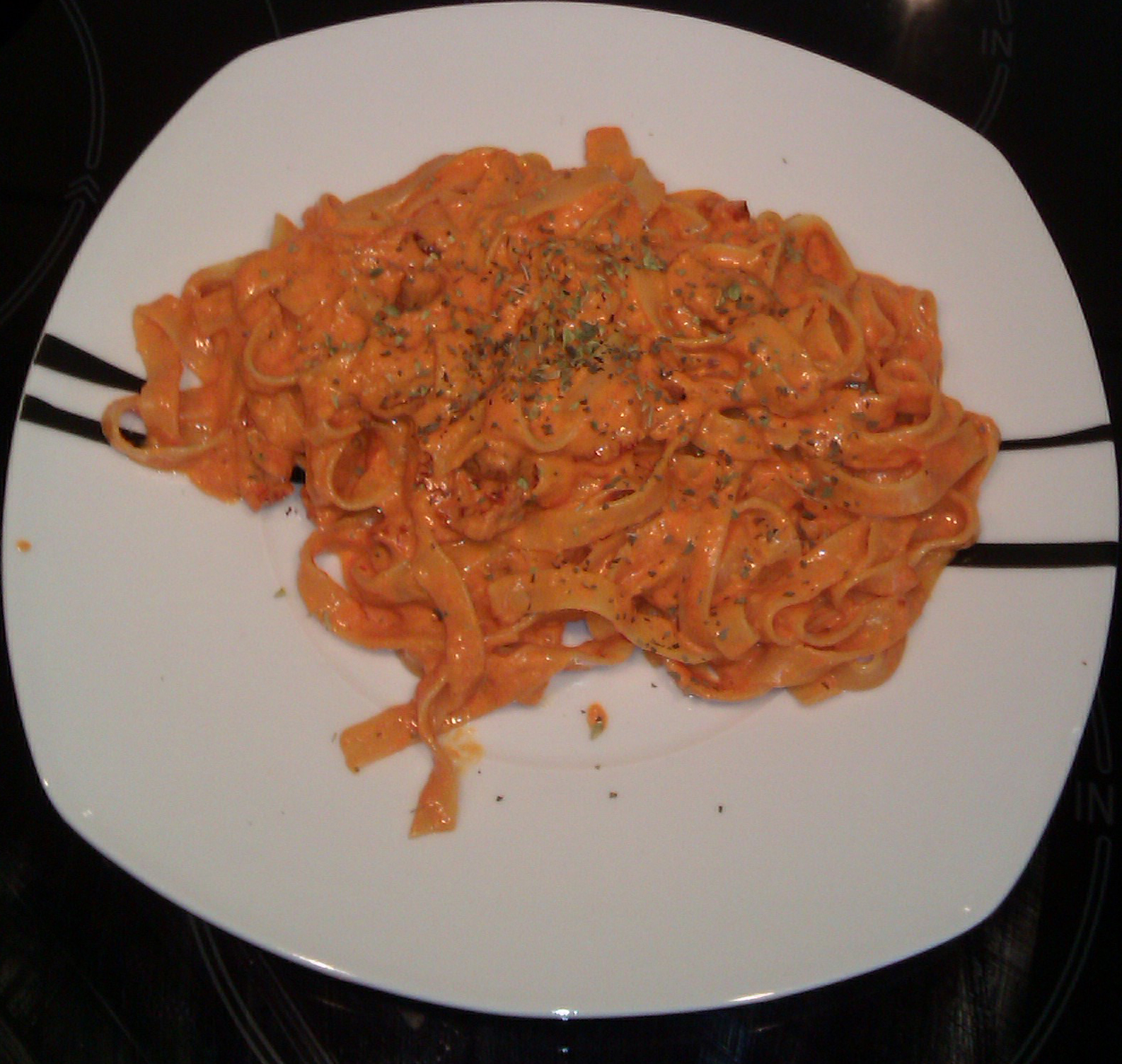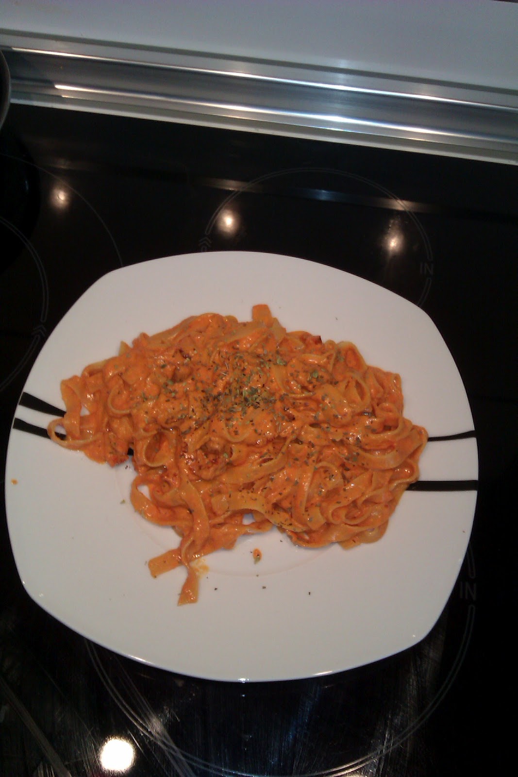 Por otra parte, hacemos la pasta, hirviendo agua con sal y dejándola tanto tiempo como el fabricante nos indique. La escurrimos, y la echamos en la sartén junto a la salsa que hemos hecho, le damos unas cuantas vueltas para que se caliente, y servimos.