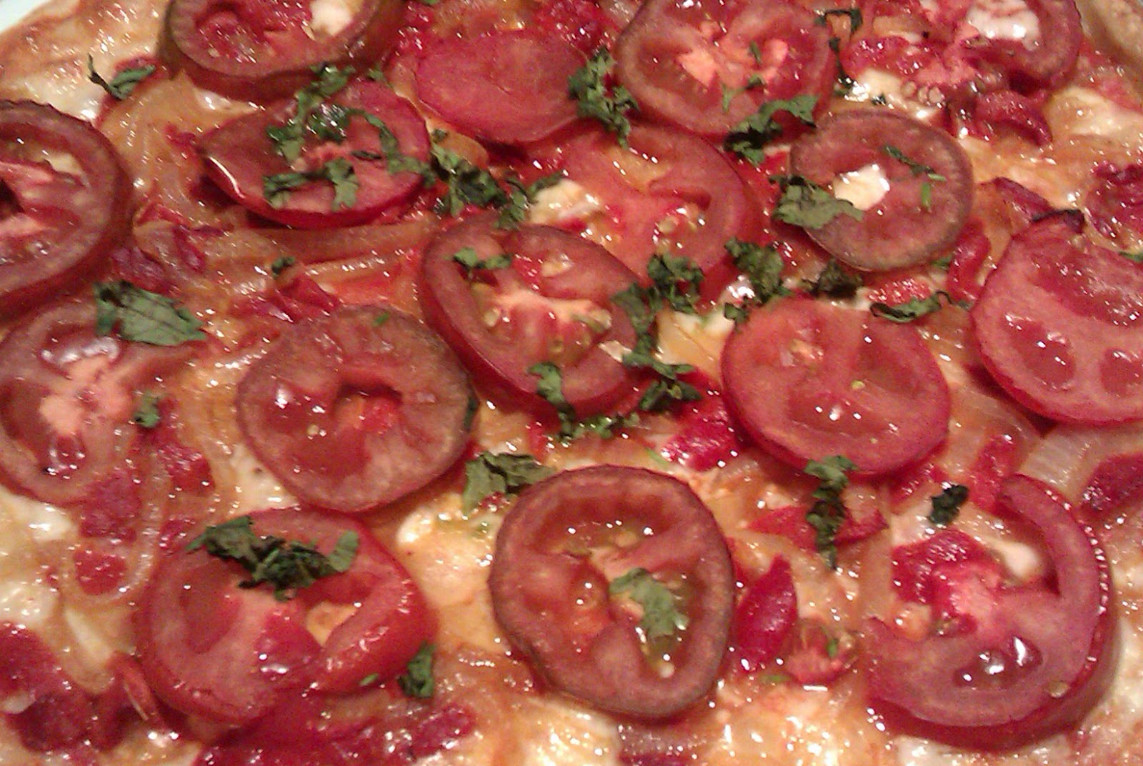 Por otra parte extendemos la masa, ponemos una capita de tomate frito, por encima una fina capa de queso rallado y encima nuestra mezcla de la sartén. Adornamos la pizza con los tomates cortados en finas rodajas y el cilantro picadito por encima.