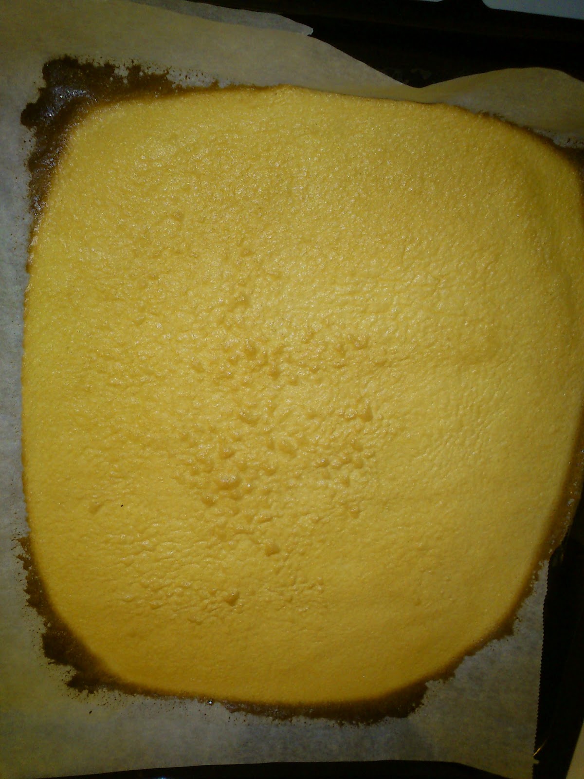 Yo hice la placa de bizcocho directamente sobre la placa del horno sobre papel vegetal porque no tenía ningún molde que me sirviera. La plancha tiene que quedar finita así que hay que extender bien la masa.