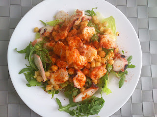 Tan fácil como hacer la ensalada. En una ensaladara echar la rúcula y la lechuga y aliñar con aceite y sal al gusto, remover y a continuación echar los garbanzos y el pulpo. Por último poner pimentón al gusto.