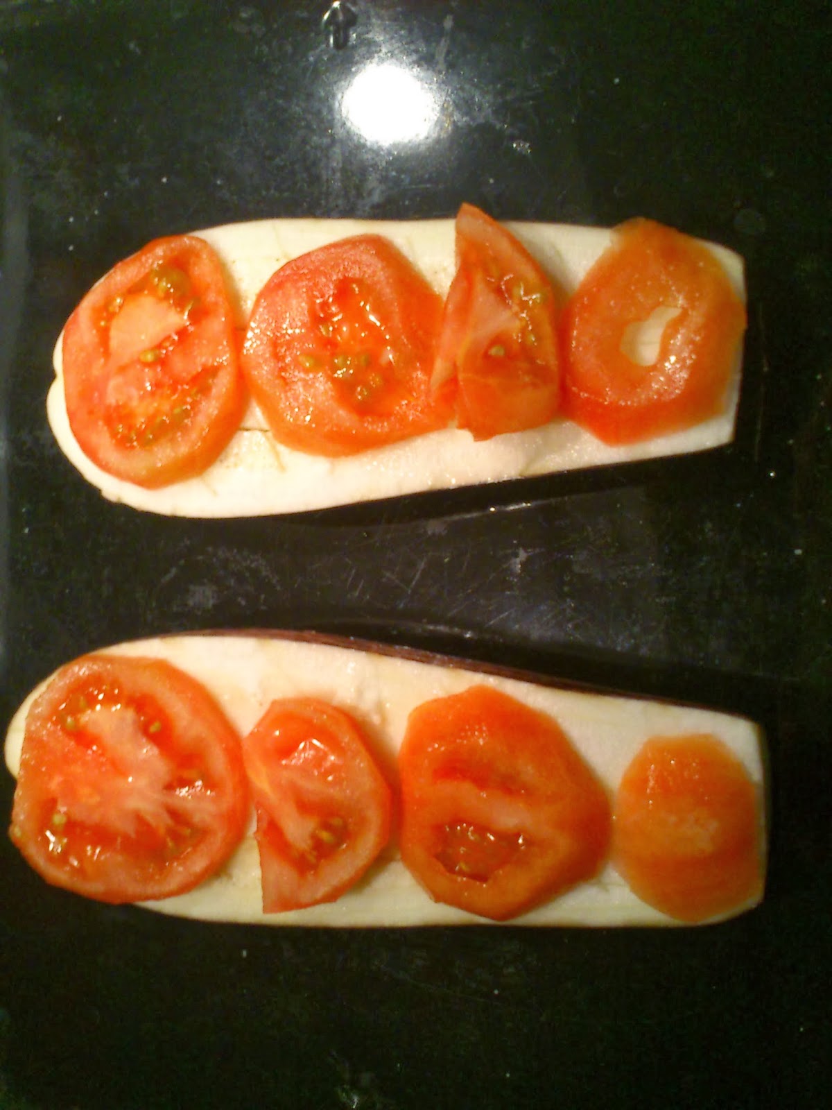 Partir la berenjena por la mitad, hacer unos cortes por encima de cada una, echar un chorrito de aceite y repartir las rodajas de tomate por encima. Meter en el horno precalentado durante 35 minutos a 220 gr. Pasado ese tiempo tienen que estar casi echas. Ponéis las anchoas por encima, 3 en cada parte y un poco de queso mozzarela. Espolvoreamos con un poco de orégano y volvemos a meter en el horno durante 10 minutos más. Sacar y comer! Riquísimo!