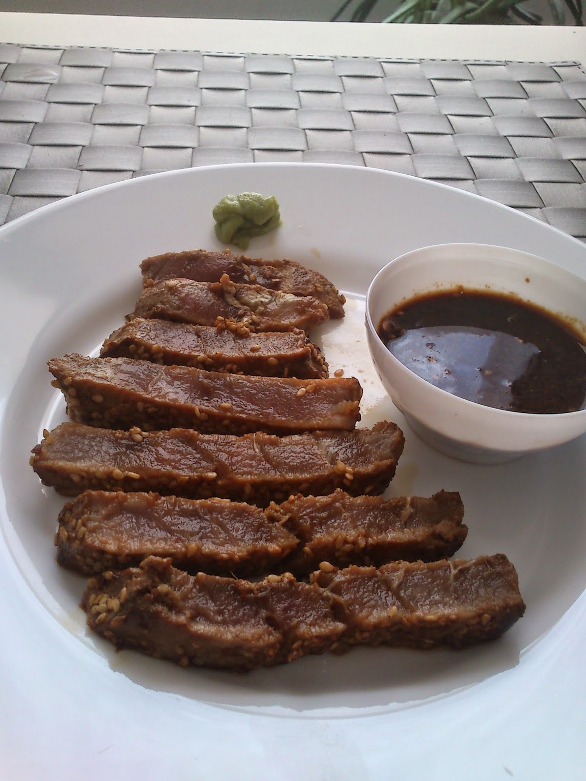 Mezclamos la salsa de soja, el jengibre y el wasabi y lo ponemos en un bol pequeño con bastante fondo. Dejamos macerar el filete unos 10 minutos por cada lado. Una vez pasado este tiempo rebozamos con las semillas de sésamo. En una sartén antiadherente a fuego fuerte hacemos vuelta y vuelta el filete de atún. Por dentro debe de quedar crudo pero si no os gusta dejar que se pase más. Servir junto a más salsa de soja y wasabi y el atún fileteado