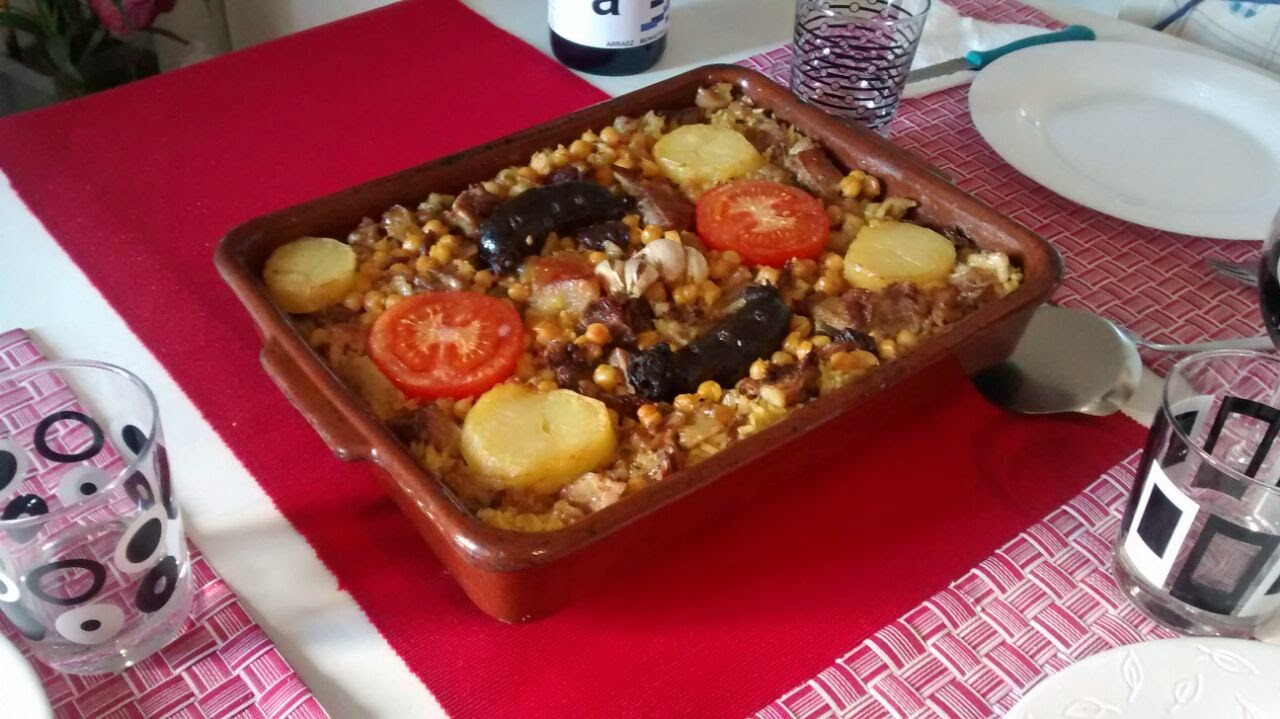 Echamos el arroz, las costillas, el caldo caliente y los restos de cocido en una fuente de barro. Ponemos las dos morcillas por encima, la cabeza de ajos y el tomate partido por la mitad.Metemos en el horno precalentado a 200º durante 20-30 minutos hasta que veamos que esté hecho. Para ver que está hecho el caldo