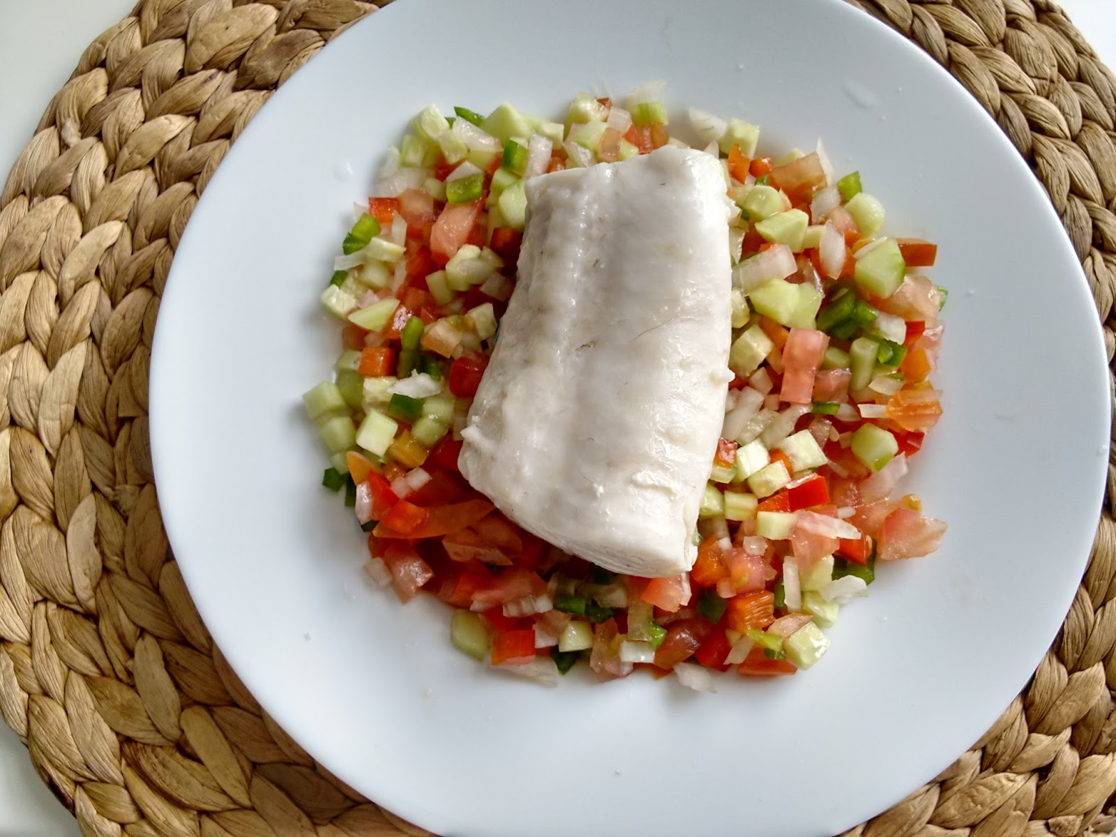 Picar muy picadito el tomate, los pimientos y la cebolla. Por otro lado cocer la merluza o como yo hacerla en una vaporera en el microondas. Para ello, la metemos dentro de la vaporera durante 4 minutos con un chorrito de agua y un poco de sal. Dejamos templar la merluza.