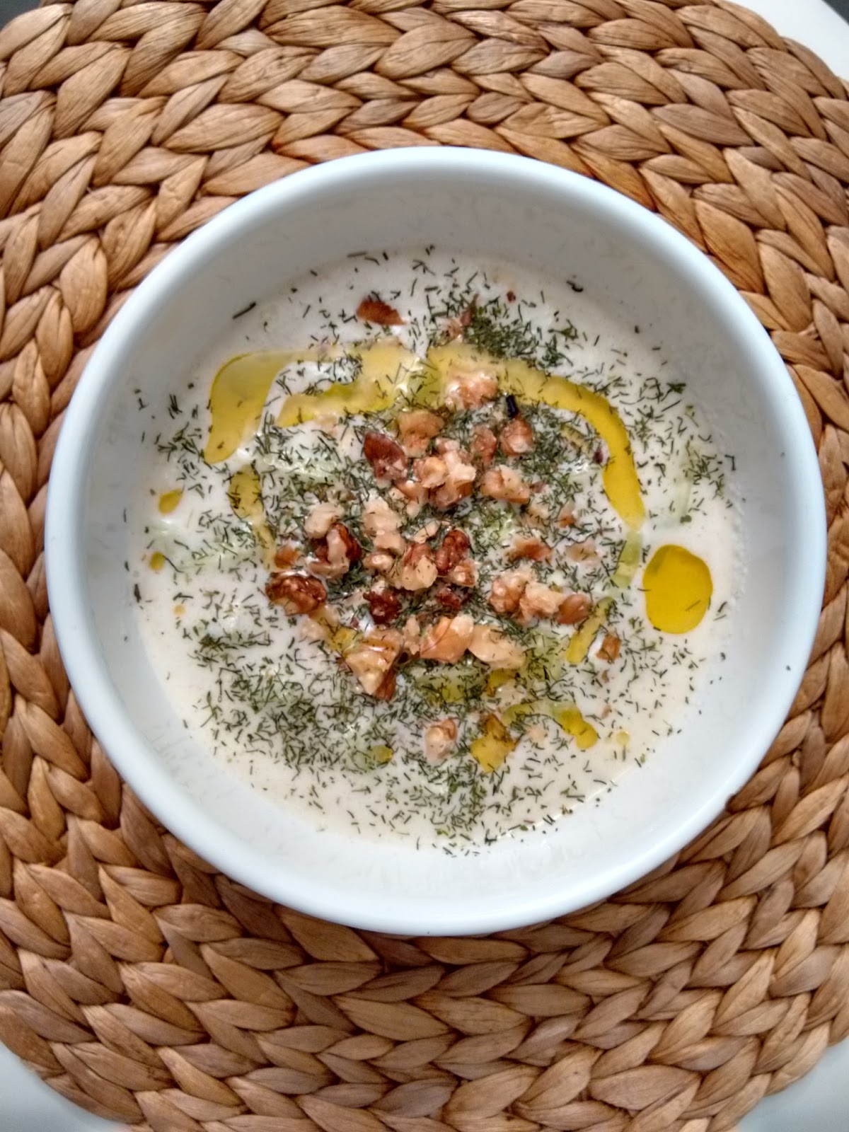 Emplatamos con el otro pepino picado por encima, eneldo, nueces partidas a trocitos y un chorrito de aceite de oliva. Entra solo con este calor!