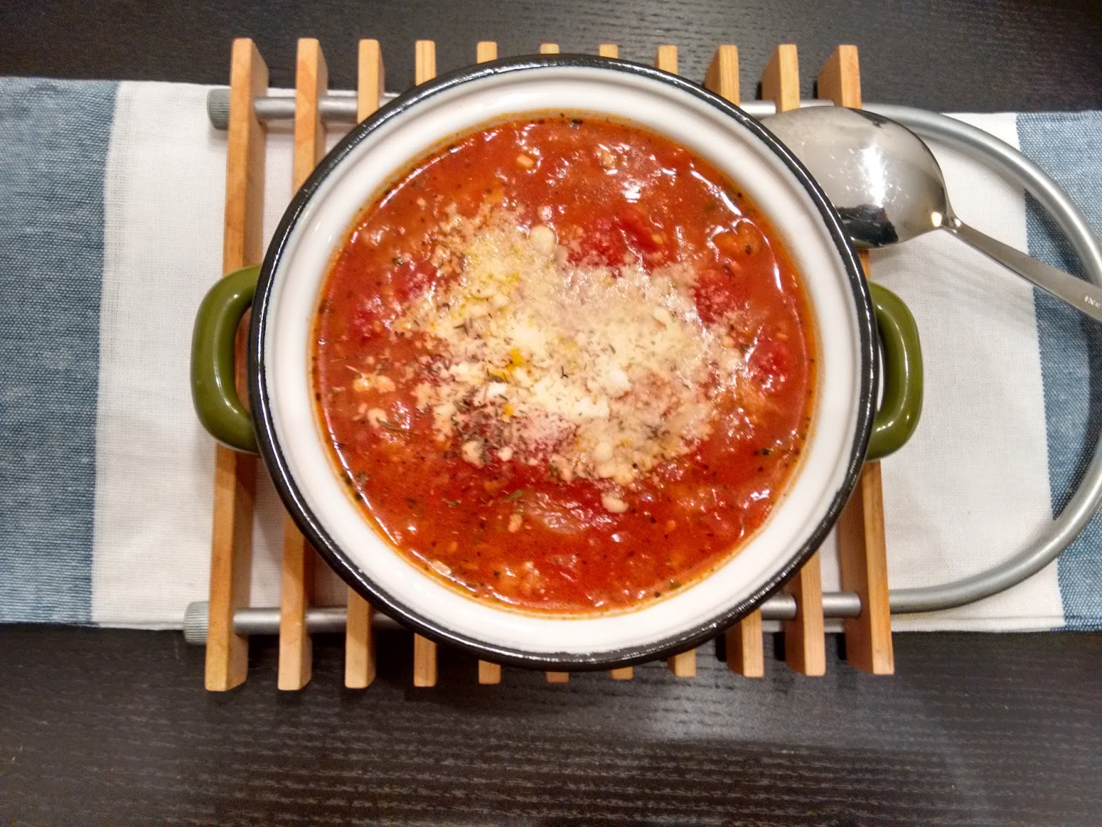 En una olla mediana echar un chorro generoso de aceite. Cuando esté caliente poner los ajos hasta que empiecen. Agregar la cebolla y cuando empiece a pocharse agregar los tomates incluso con el caldo que viene en la lata y el caldo de pollo. Dejar hervir unos 15 minutos, agregar el pan y dejar hervir otros 5 minutos. Poner las hierbas, remover bien y quitar del fuego. Seguir con una cucharada generosa de queso parmesano. Para estos fríos esta sopa viene fenomenal!