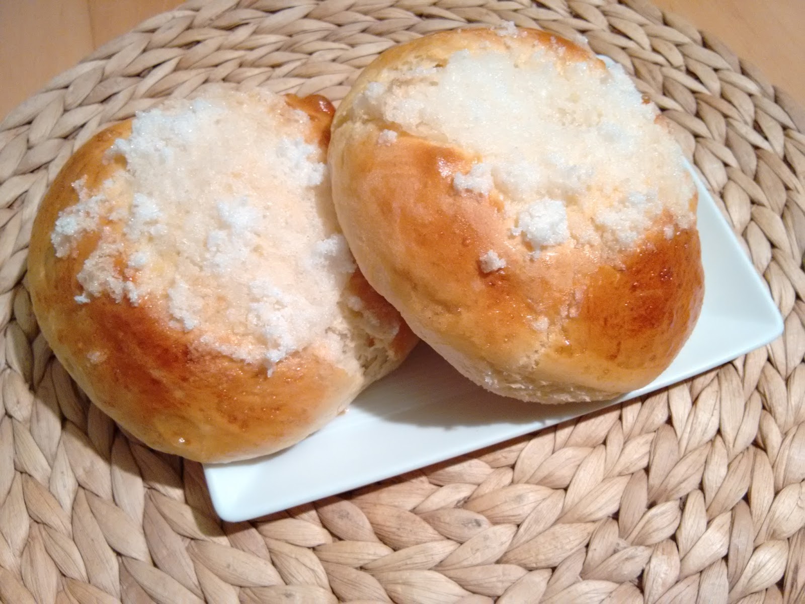 Una vez han doblado su tamaño, pintar las bolas con huevo batido y poner montañitas sobre el corte que hicimos de azúcar mezclado con agua de azahar (si no tenéis agua de azahar usad agua) que queden grumos un poco grandes.