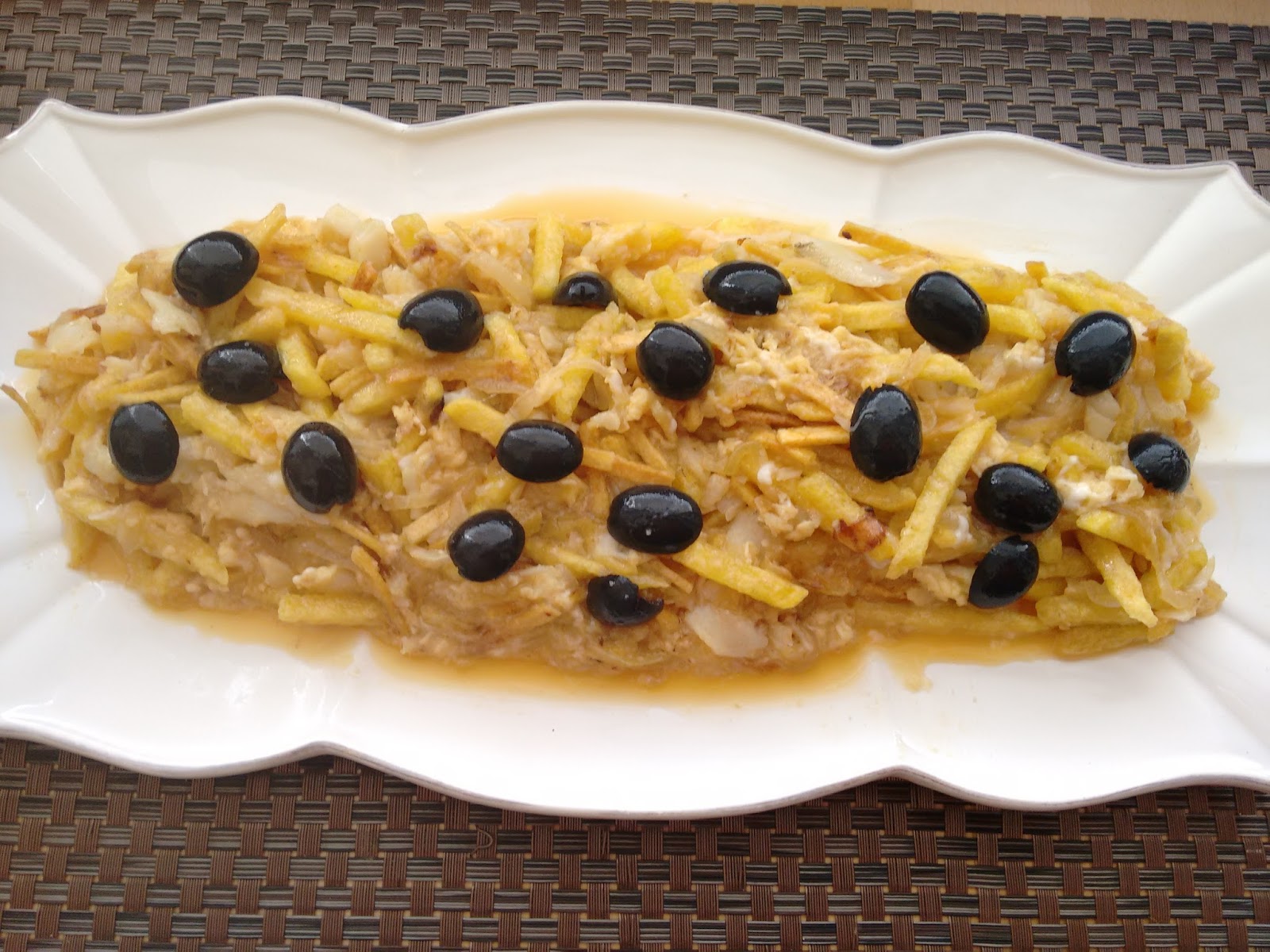 Agregamos la patata y en seguida los huevos bien batidos con sal al gusto (cuidado que las patatas y el bacalao ya tienen sal). Dejamos que se cuaje un poco y servimos rápidamente para que no se enfríe y cuaje en exceso aunque esto a gusto de cada uno. Decoramos con aceitunas negras y si nos gusta con un poco de cilantro.