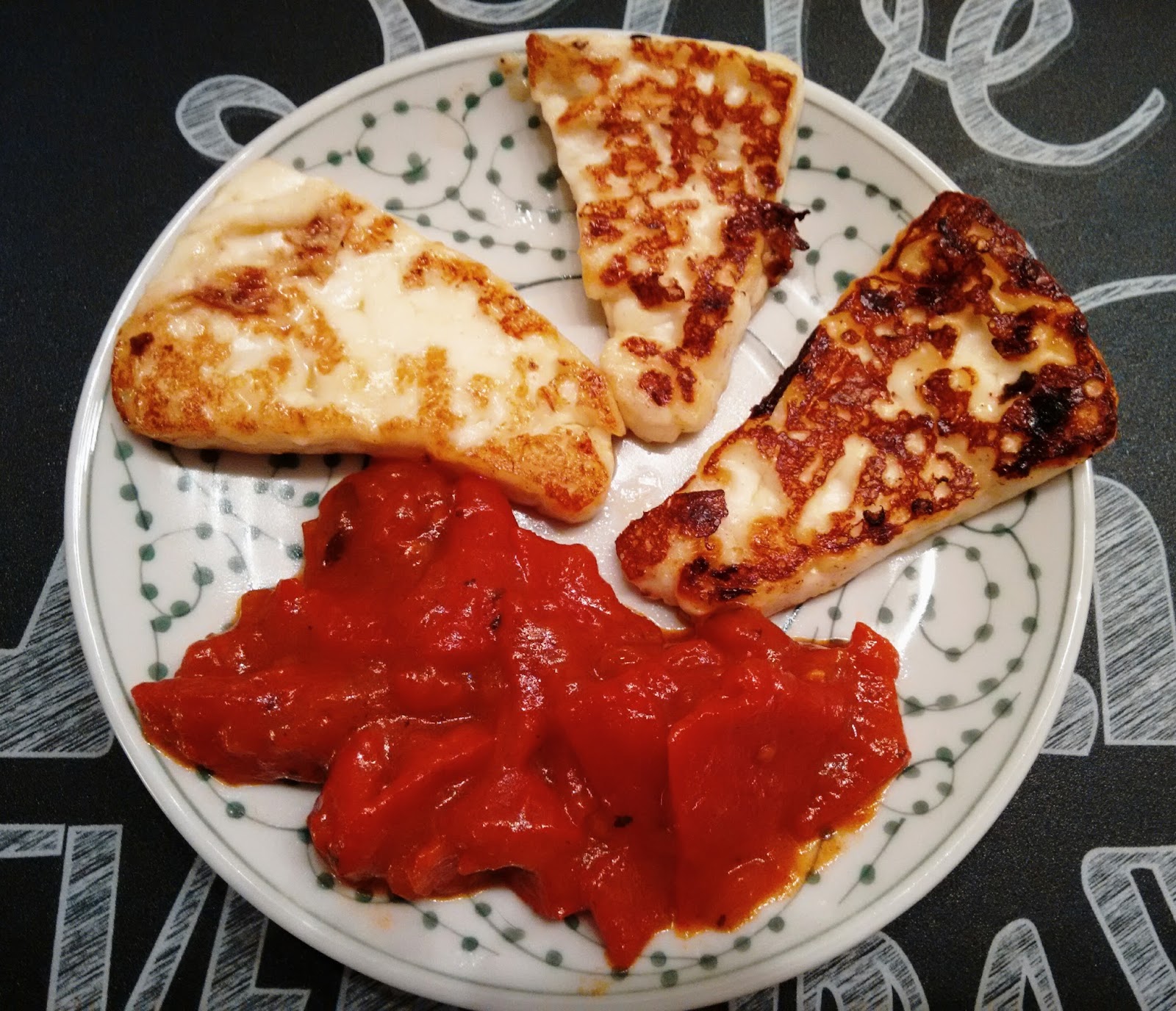 En una plancha con unas gotas de aceite a fuego fuerte ponemos el queso partido en lonchas de un dedo de ancho aproximadamente. Cuando veamos que empieza a tostarse damos la vuelta para que se tueste por otro lado. Sacamos y servimos con la salsa de tomate. Comer bien caliente, es un entrante muy original.