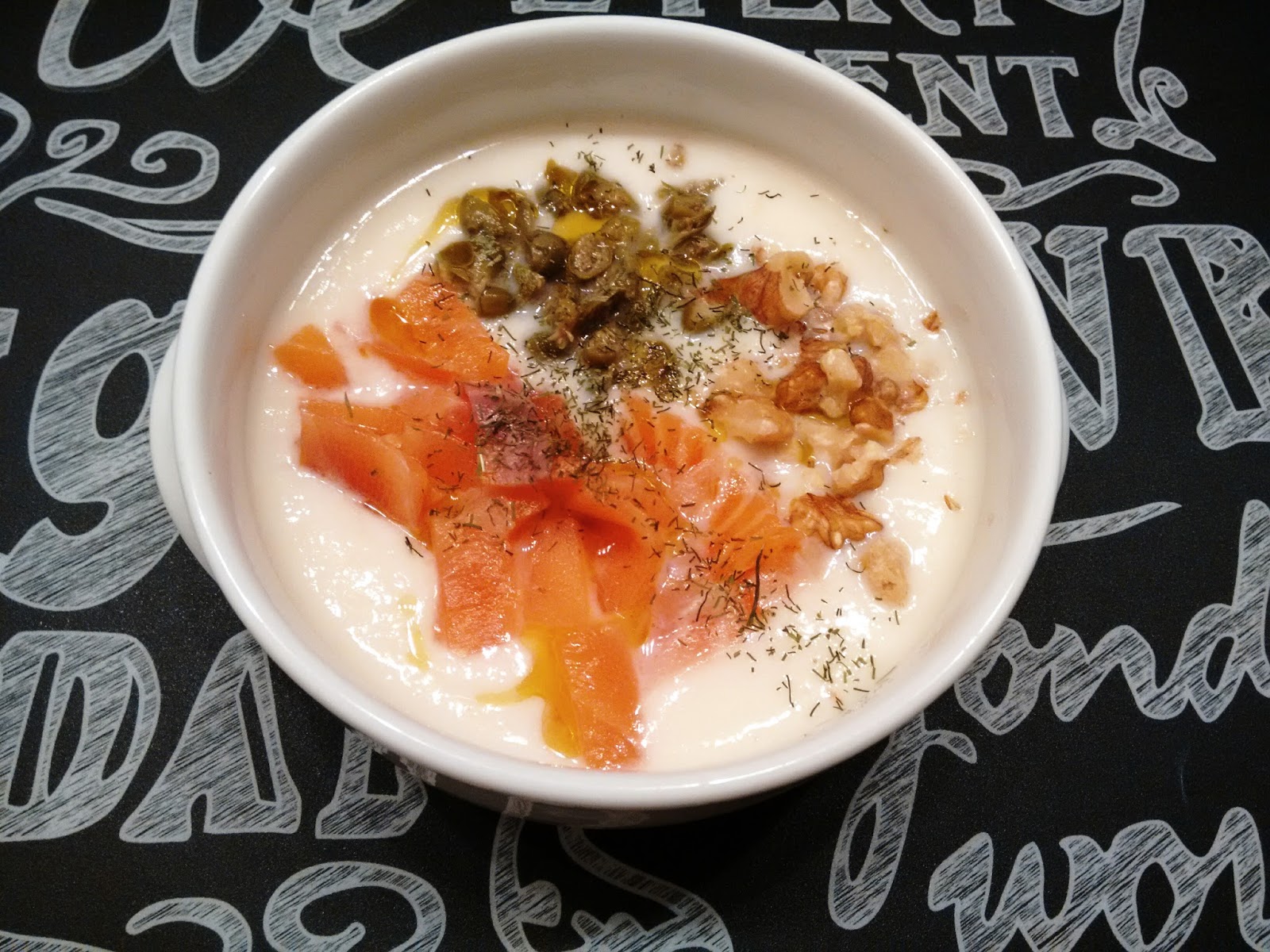 Servimos en un bol y ponemos las nueces muy picadas por encima, las alcaparras picadas finas y el salmón partido en finas longas. Adornamos con un poco de eneldo y unas gotas de aceite.