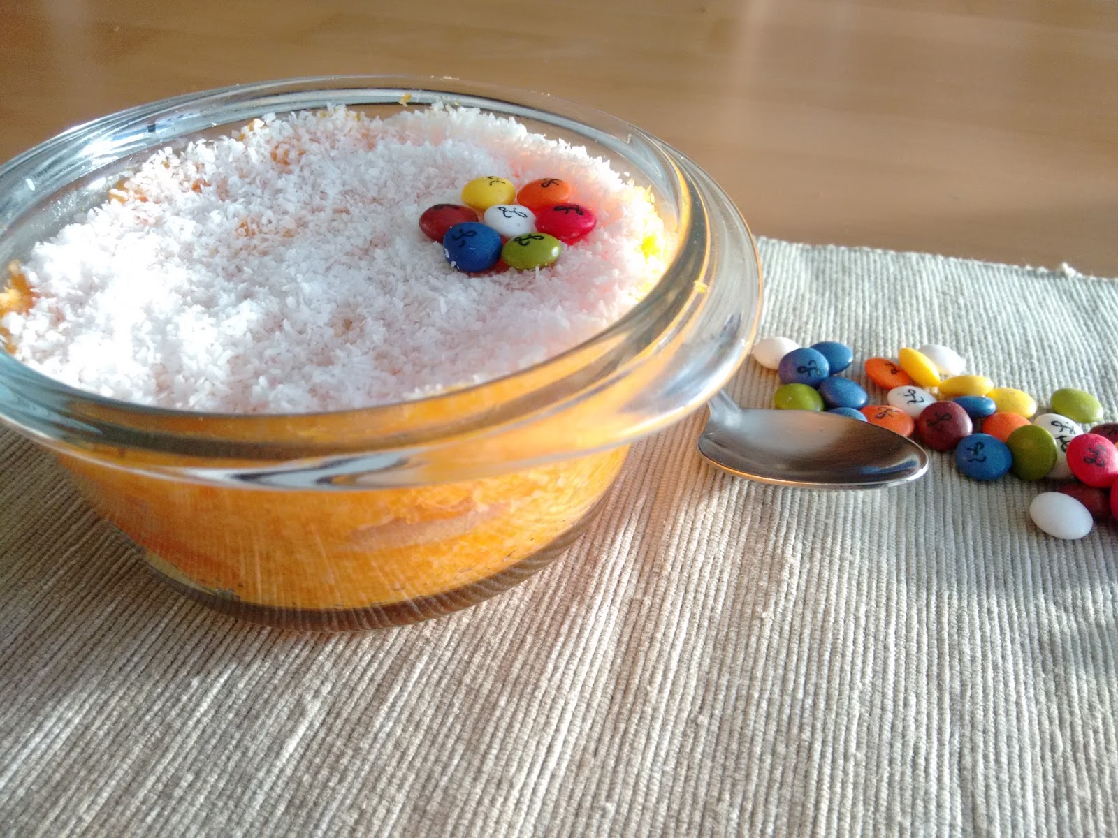 En un molde de tarta puse una base de bizcochitos, los remojé bien de almíbar hasta que quedaron empapados. Después una capa de la crema de zanahoria y coco y luego otra de bizcochitos con almíbar. Acabamos con una última de crema de zanahoria y coco y decoramos en mi caso con un poco de coco rallado y unos lacasitos minis blancos. Dejar enfriar varias horas en la nevera.