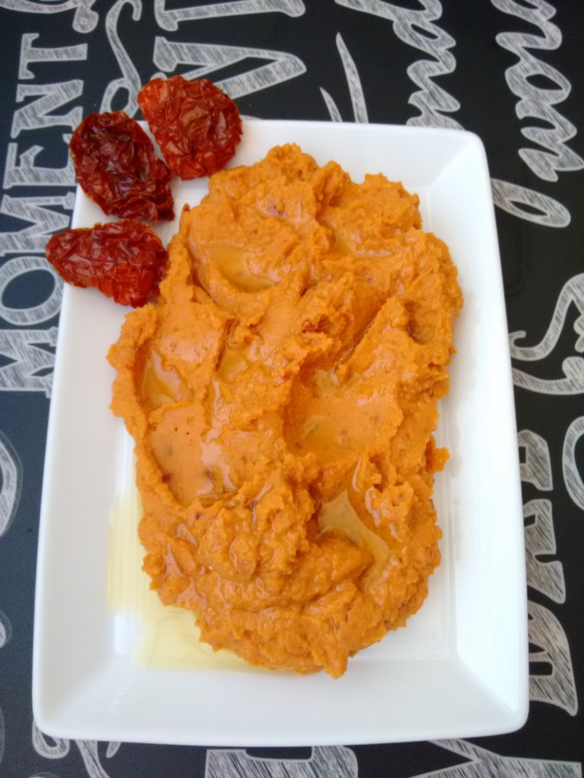 Mezclar los ingredientes con la batidora, probar y rectificar de sal, aceite y especias. Para rehidratar los tomates secos echadlos en agua caliente durante 1h. Si véis que el humus os queda muy compacto podéis aprovechar el agua de rehidratar los tomates y un poco más de aceite.