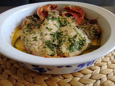 Para quitarle unas pocas calorías en lugar de sofreir la cebolla, el pimiento verde y las patatas las hice antes al vapor y luego las metí en el horno unos minutos antes que el pescado.