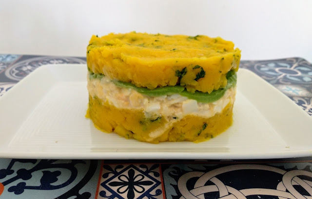 Por último vamos a montar la causa, con ayuda de un emplatador, si no tenéis también de puede hacer a mano o con ayuda de un bol, ponemos un primer piso de patata de más o menos un centímetro y medio de grosor. Ponemos una capa de cangrejo y huevo, otra capa de aguacate y finalizamos con otra capa de patata.