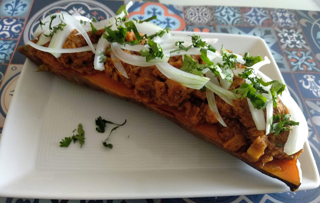 Preparé varios boniatos asados y me los comí de maneras distintas: con yogur y nueces para desayunar y con cochinita pibil en plan salado. Merece la pena ya que encendemos el horno meter varias unidades de boniato para varios días. En muchos paises a lo largo del mundo se prepara de infinitas maneras, desde pasteles hasta guisos.